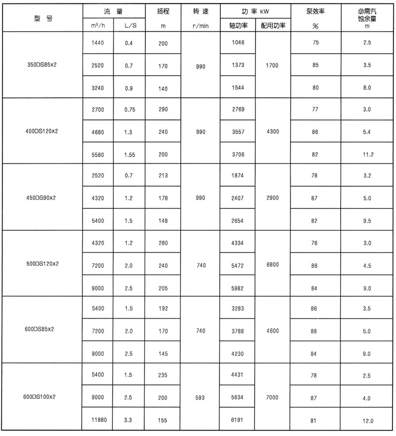 型號意義:以400DS-120×2為例 400-水泵進(jìn)水口名義直徑(mm)DS一多級雙進(jìn)口中開(kāi)離心泵 120-水泵名義單級揚程(m) 2-水泵級數