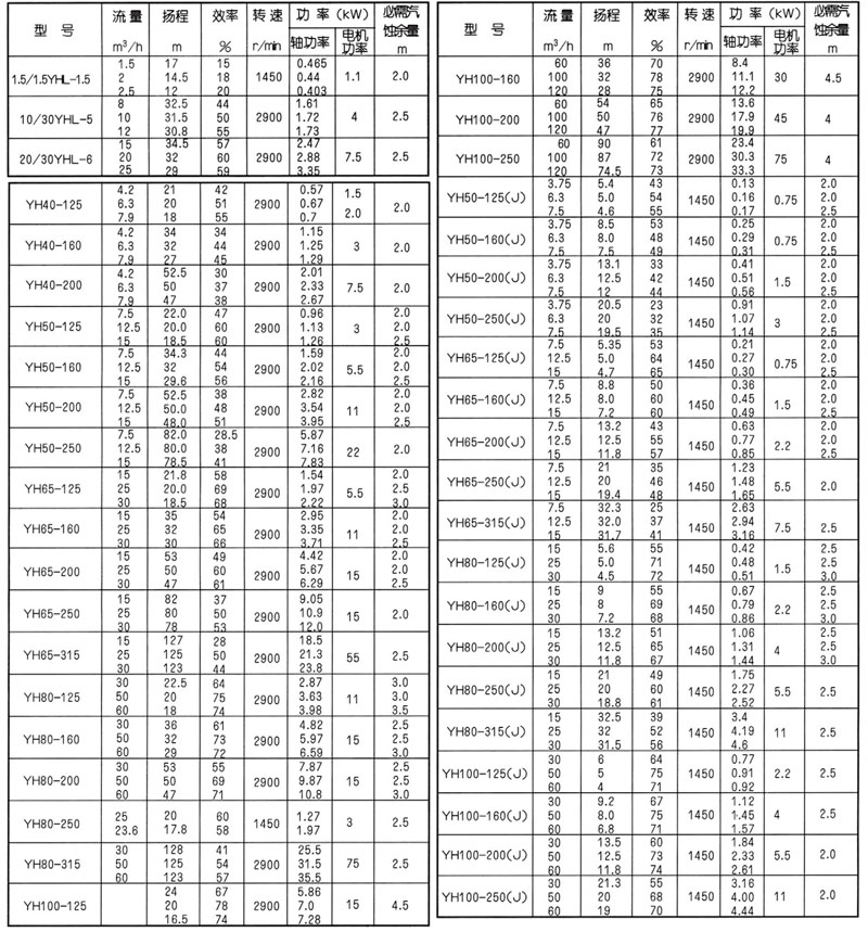 YH和YHL系列泵是單級、單吸、液下式離心泵(1.5/1.5YHLI.5是旋渦泵),流量范圍1.5~120m/h;揚程范圍2.5~127m。用于汲送井罐中不含固體顆粒、無(wú)腐蝕性的介質(zhì)(如發(fā)煙硫酸)。介質(zhì)最高溫度80℃。