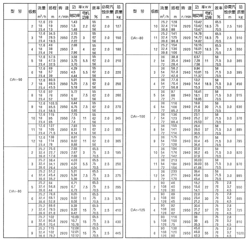 DA1泵是單吸、多級、分段式離心泵,用于汲送清水及無(wú)腐蝕性的液體,改變過(guò)流零件的材料,可供礦山排送酸性水。介質(zhì)最高溫度80℃。流量范圍3~350m3/h,揚程范圍13~400m。