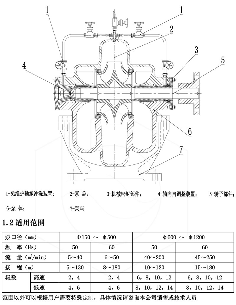 ES 型雙吸泵的軸承為位于泵體內部的自潤滑軸承來(lái)支撐轉子部件,其較大優(yōu)點(diǎn)是免維護(即無(wú)需日常維護保養),并具有安裝空間小、運行平穩、效率高,運行及檢修費用更低。