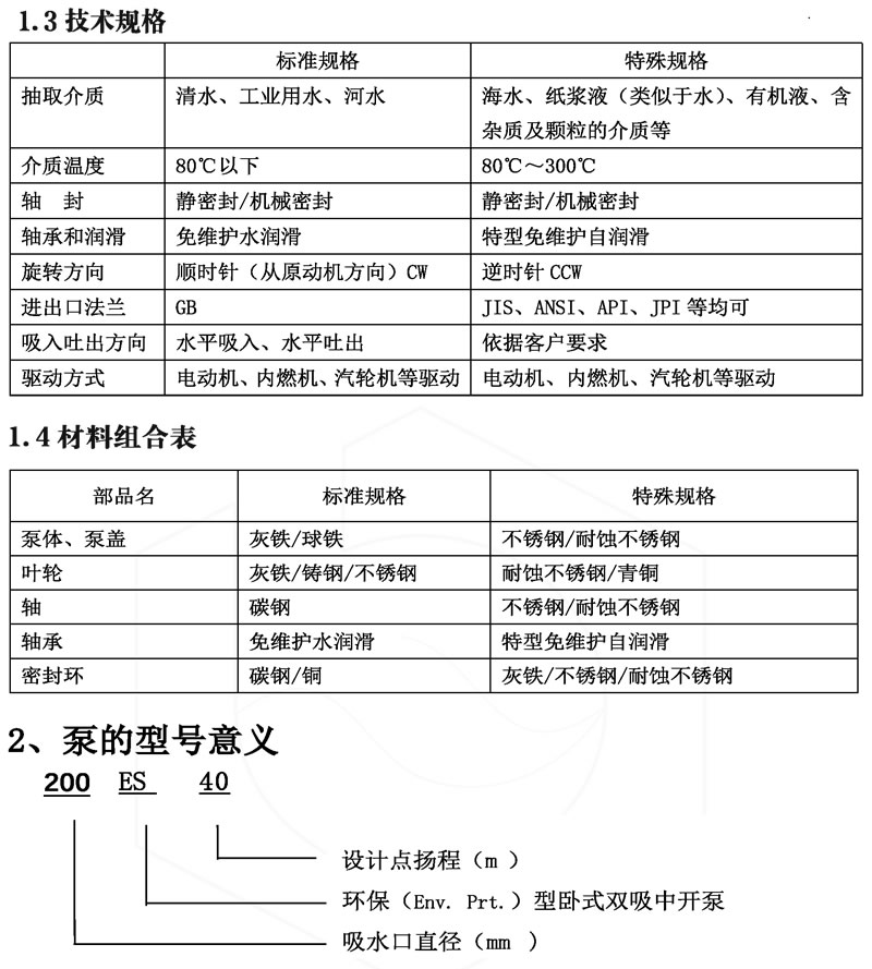 ES 系列環(huán)保免維護單級雙吸中開(kāi)臥式和立式離心泵,是我公司在總結多年雙吸泵制造及應用經(jīng)驗的基礎上,結合用戶(hù)在用泵過(guò)程中的痛點(diǎn),由公司專(zhuān)家與國內外專(zhuān)家共同創(chuàng )造發(fā)明的一種新型水泵(臥式泵專(zhuān)利號:ZL 201822092944.2;立式泵專(zhuān)利號:ZL 2019 2 0293130.7)。其主要特點(diǎn)是環(huán)保、免維護。